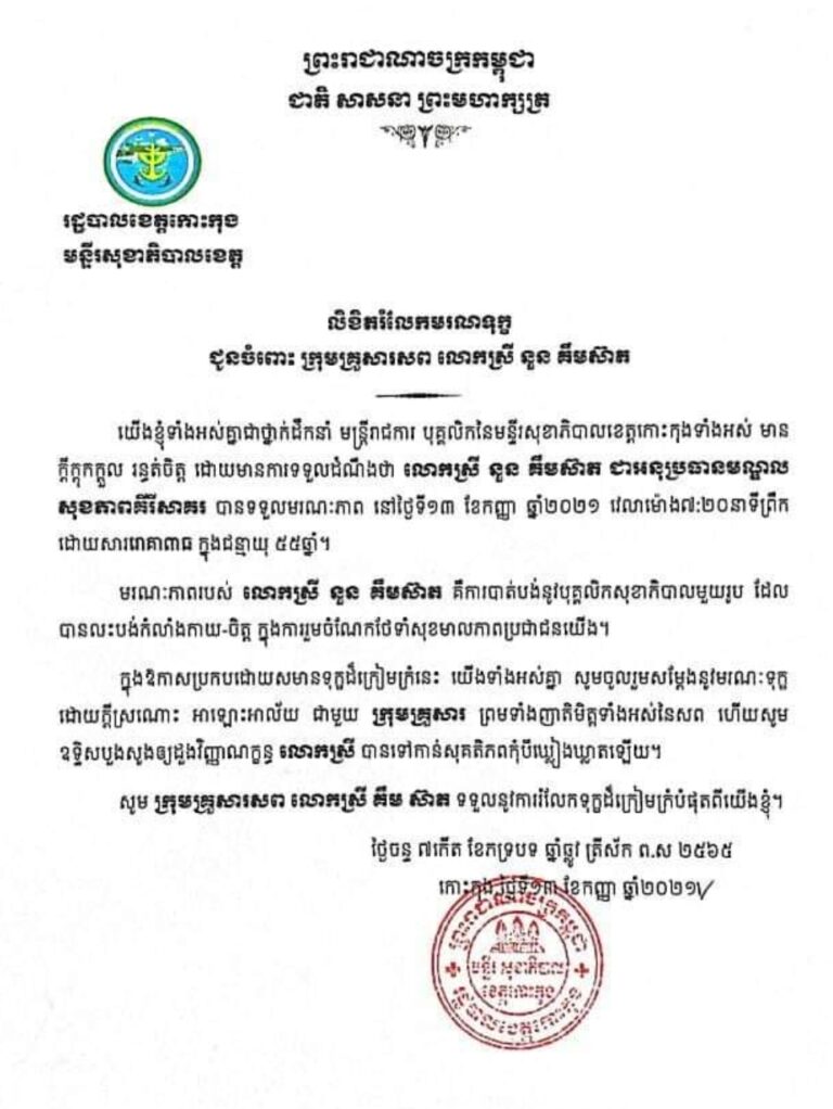 មន្ទីរសុខាភិបាល នៃរដ្ឋបាលខេត្តកោះកុង ចូលរួមរំលែកមរណទុក្ខ ជូនចំពោះ ក្រុមគ្រួសារសព លោកស្រី នួន គឹមស៊ាត