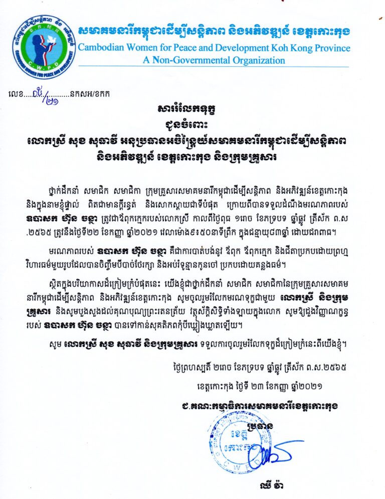 សមាគមនារីកម្ពុជាខេត្តកោះកុង សូមចូលរួមរំលែកទុក្ខ ចំពោះ លោកស្រី សុខ សុធាវី អនុប្រធានអចិន្ដ្រៃយ៍សមាគមនារីខេត្ត និងក្រុមគ្រួសារ