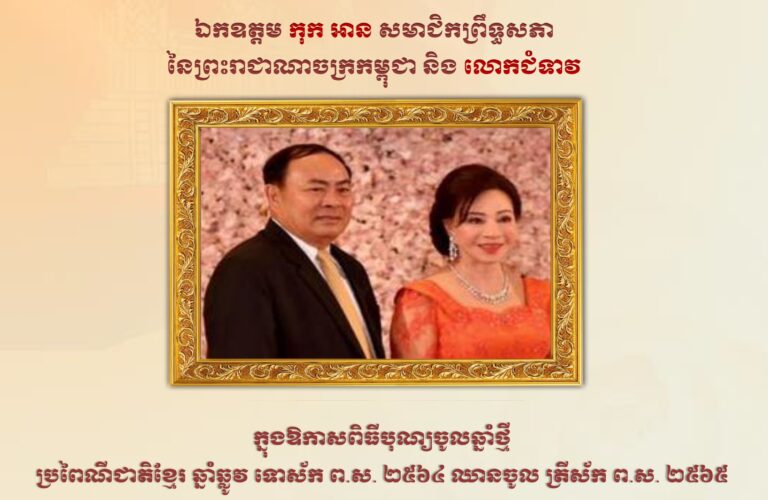 សារគោរពជូនពរ ឯកឧត្តម កុក អាន សមាជិកព្រឹទ្ធសភា នៃព្រះរាជាណាចក្រកម្ពុជា និងលោកជំទាវ ក្នុងឱកាសពិធីបុណ្យចូលឆ្នាំថ្មី ប្រពៃណី ឆ្នាំឆ្លូវ ទោស័ក ព.ស.២៥៦៤ ឈានចូល ត្រីស័ក ព.ស.២៥៦៥ សូមគោរពជូនពរ ពីរដ្ឋបាលខេត្តកោះកុង និងបងប្អូនប្រជាពលរដ្ឋទូទាំងខេត្តកោះកុង