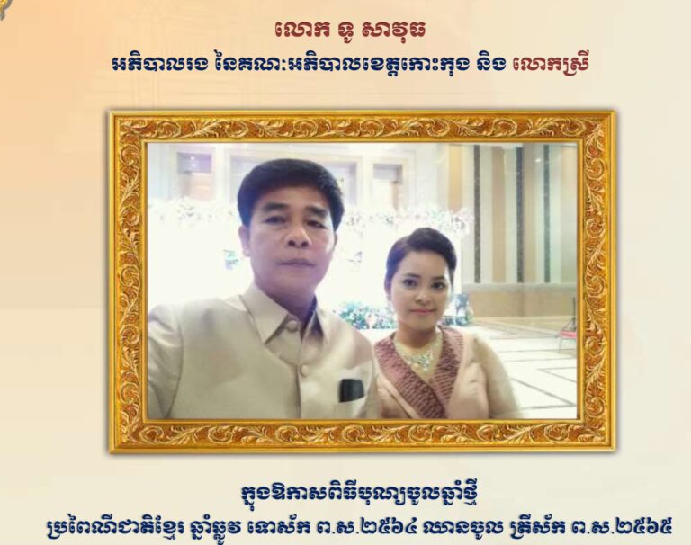 សារគោរពជូនពរ លោក ទូ សាវុធ អភិបាលរង នៃគណៈអភិបាលខេត្តកោះកុង និងលោកស្រី ក្នុងឱកាសពិធីបុណ្យចូលឆ្នាំថ្មី ប្រពៃណី ឆ្នាំឆ្លូវ ទោស័ក ព.ស.២៥៦៤ ឈានចូល ត្រីស័ក ព.ស.២៥៦៥ សូមគោរពជូនពរ ពីមន្ត្រីបង្គោលព័ត៌មានវិទ្យា សាលាខេត្តកោះកុង