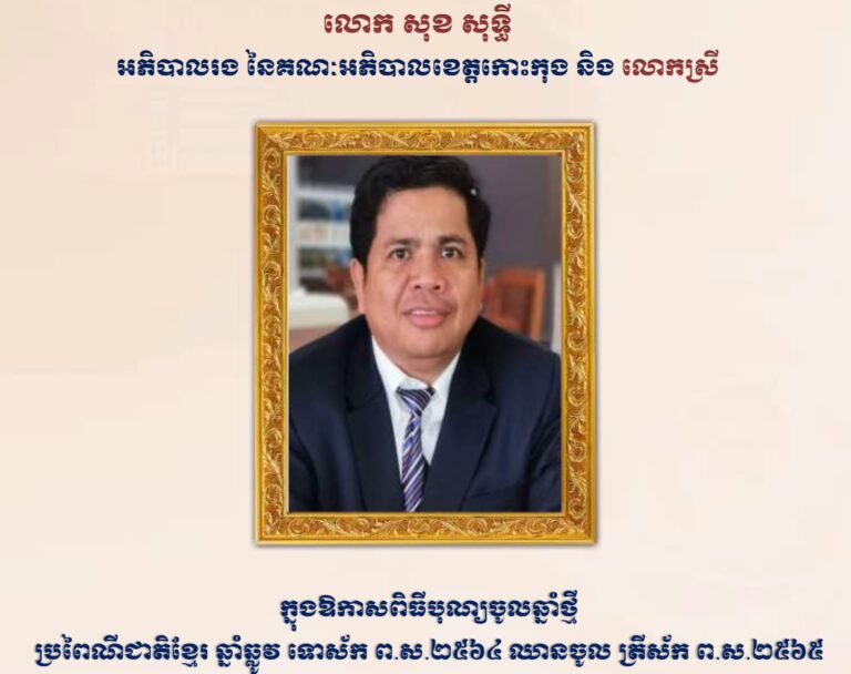 សារគោរពជូនពរ លោក សុខ សុទ្ធី អភិបាលរង នៃគណៈអភិបាលខេត្តកោះកុង ក្នុងឱកាសពិធីបុណ្យចូលឆ្នាំថ្មី ប្រពៃណី ឆ្នាំឆ្លូវ ទោស័ក ព.ស.២៥៦៤ ឈានចូល ត្រីស័ក ព.ស.២៥៦៥ សូមគោរពជូនពរ ពីមន្ត្រីបង្គោលព័ត៌មានវិទ្យា សាលាខេត្តកោះកុង