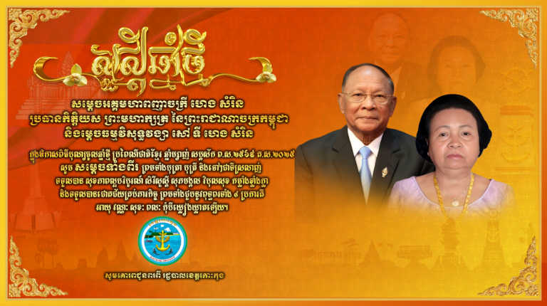 សារជូនពរ សូមគោរពជូន សម្តេចអគ្គមហាពញាចក្រី ហេង សំរិន ប្រធានកិត្តិយសក្រុមឧត្តមប្រឹក្សាផ្ទាល់ ព្រះមហាក្សត្រ និងសម្តេចធម្មវិសុទ្ធវង្សា សៅ ទី ហេងសំរិន ក្នុងឱកាសពិធីបុណ្យចូលឆ្នាំថ្មី ប្រពៃណីជាតិខ្មែរ ឆ្នាំម្សាញ់ សប្តស័ក ព.ស.២៥៦៩ គ.ស.២០២៥ សូមគោរពជូនពរពី រដ្ឋបាលខេត្តកោះកុង