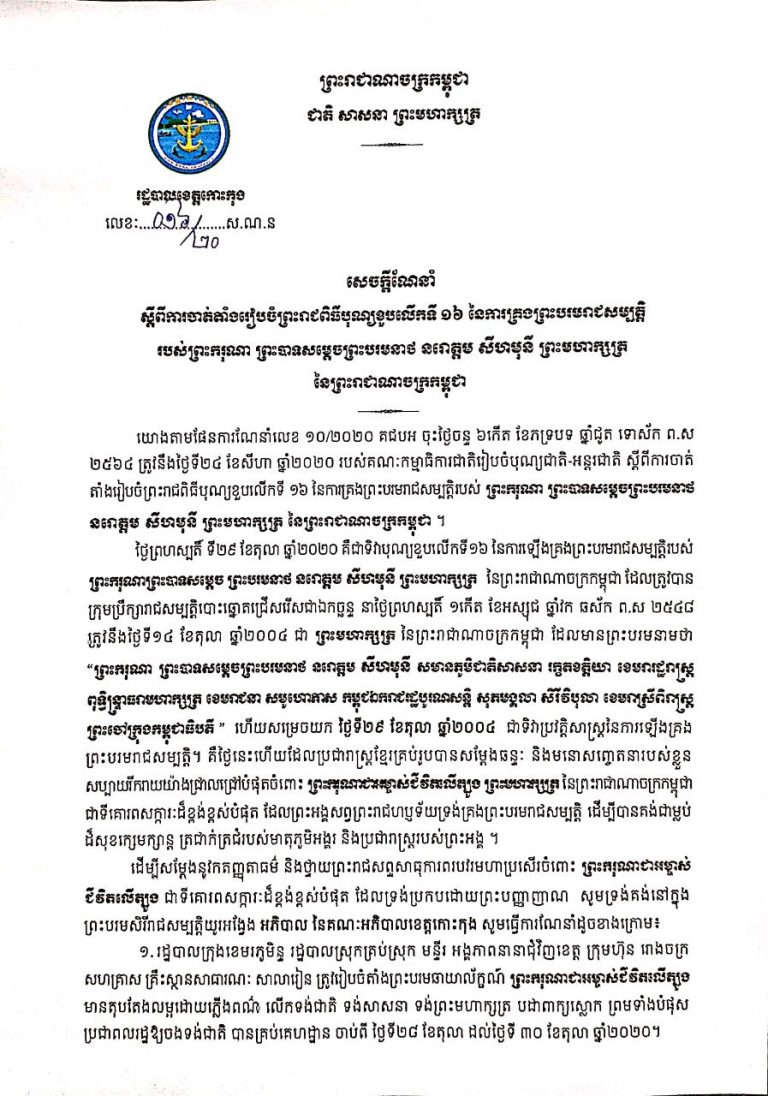 សេចក្តីណែនាំ ស្តីពីការចាត់តាំងរៀបចំព្រះរាជពិធីបុណ្យខួបលើកទី១៦ នៃការគ្រងព្រះបរមរាជសម្បត្តិ របស់ព្រះករុណា ព្រះបាទសម្ដេចព្រះបរមនាថ នរោត្ដម សីហមុនី ព្រះមហាក្សត្រ នៃព្រះរាជាណាចក្រកម្ពុជា