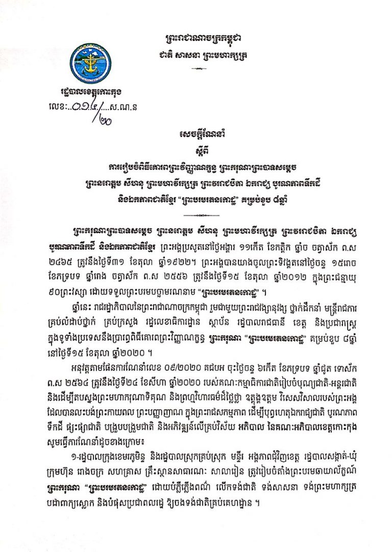 សេចក្តីណែនាំ ស្តីពីការរៀបចំពិធីគោរពព្រះវិញ្ញាណក្ខន្ធ ព្រះករុណាព្រះបាទសម្ដេច ព្រះនរោត្តម សីហនុ ព្រះមហាវីរក្សត្រ ព្រះវររាជបិតា ឯករាជ្យ បូរណភាពទឹកដី និងឯកភាពជាតិខ្មែរ “ព្រះបរមរតនកោដ្ឋ” គម្រប់ខួប ៨ ឆ្នាំ