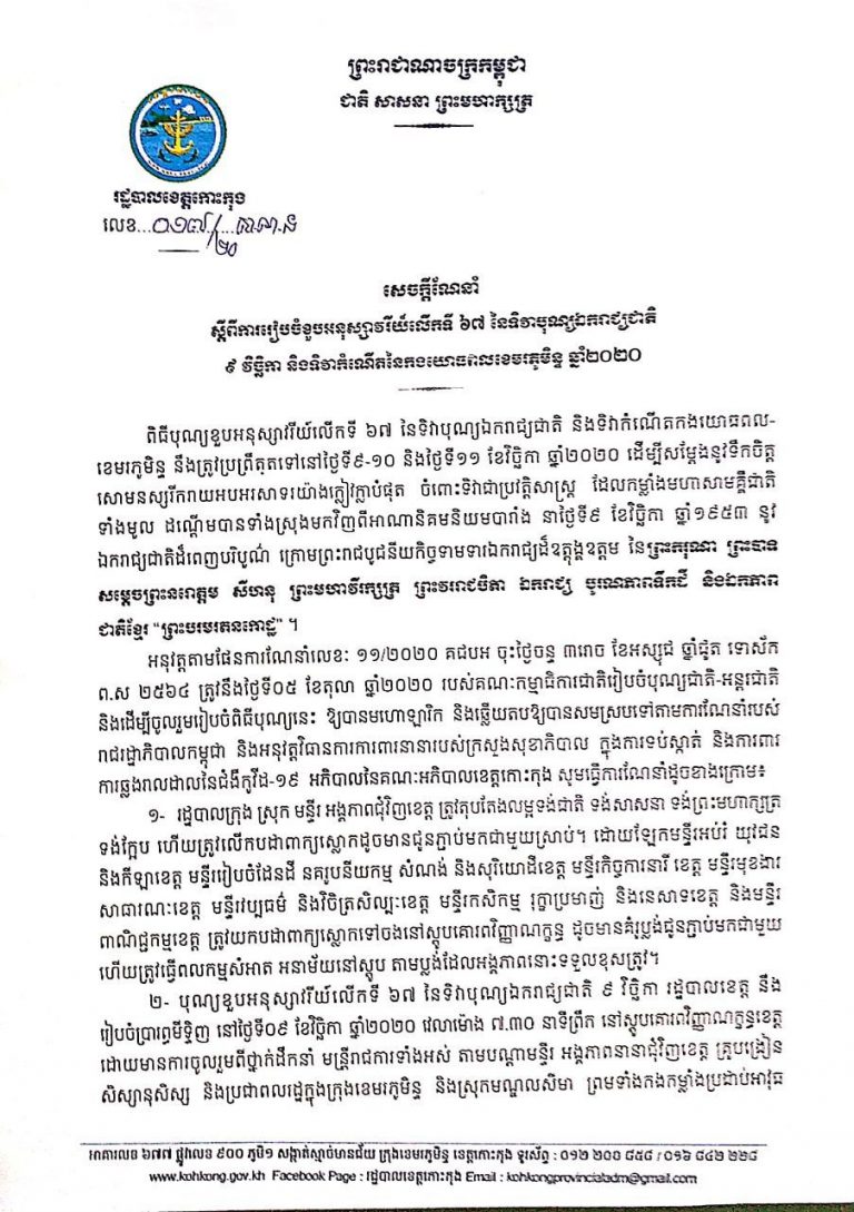 សេចក្តីណែនាំ ស្តីពីការរៀបចំខួបអនុស្សាវរីយ៍លើកទី ៦៧ នៃទិវាបុណ្យឯករាជ្យជាតិ ៩ វិច្ឆិកា និងទិវាកំណើតនៃកងយោធពលខេមរភូមិន្ទ ឆ្នាំ២០២០
