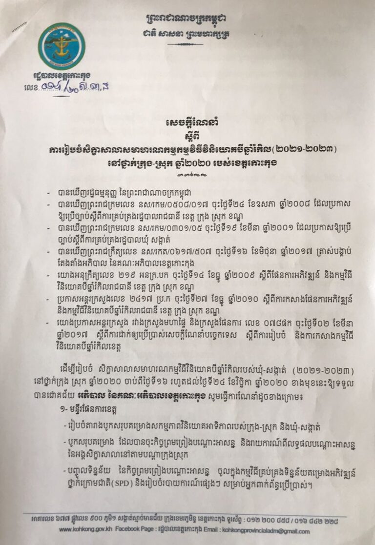 សេចក្តីណែនាំ ស្តីពីការរៀបចំសិក្ខាសាលាសមាហរណកម្មកម្មវិធីវិនិយោគបីឆ្នាំរំកិល(២០២១-២០២៣) នៅរដ្ឋបាលក្រុង-ស្រុក ឆ្នាំ២០២០ របស់ខេត្តកោះកុង