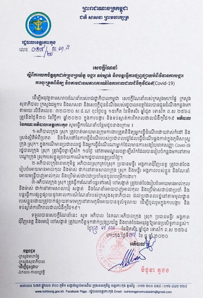 សេចក្តីណែនាំ ស្តីពីការយកចិត្តទុកដាក់ប្រុងប្រយ័ត្ន បង្ការ ទប់ស្កាត់ និងបន្តធ្វើការផ្សព្វផ្សាយអំពីវិធានការបង្ការ ការចុះត្រួតពិនិត្យ និងតាមដានសភាពការណ៍នៃការរាលដាលជំងឺកូវីដ១៩ (Covid-19)