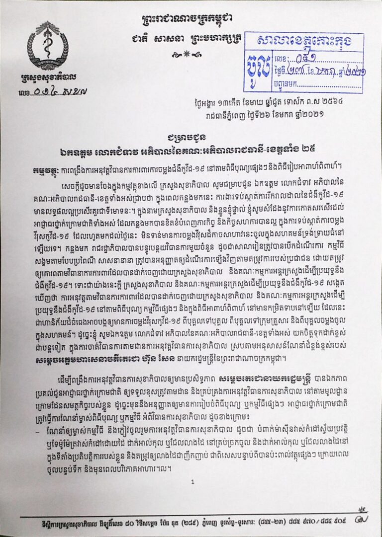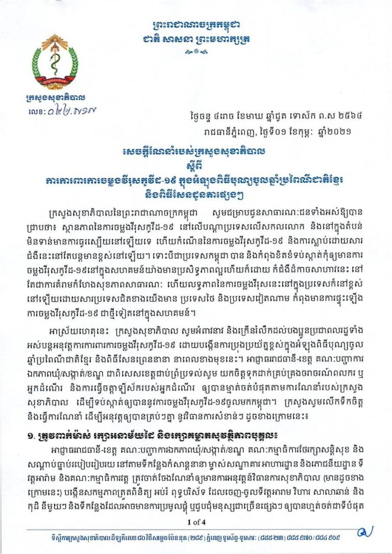 សេចក្តីណែនាំ របស់ក្រសួងសុខាភិបាល ស្តីពីការការពារការចម្លងវីរ៉ុសកូវីដ-១៩ ក្នុងអំឡុងពិធីបុណ្យចូលឆ្នាំថ្មីប្រពៃណីជាតិខ្មែរ និងពិធីសែនដូនតាផ្សេងៗ