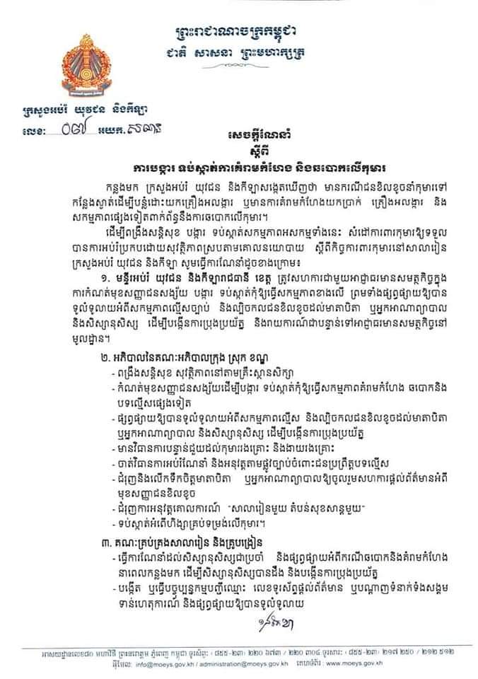 សេចក្តីណែនាំ របស់ក្រសួងអប់រំ យុវជន និងកីឡា ស្តីពីការបង្ការ ទប់ស្កាត់ការគំរាមកំហែង និងឆបោកលើកុមារ