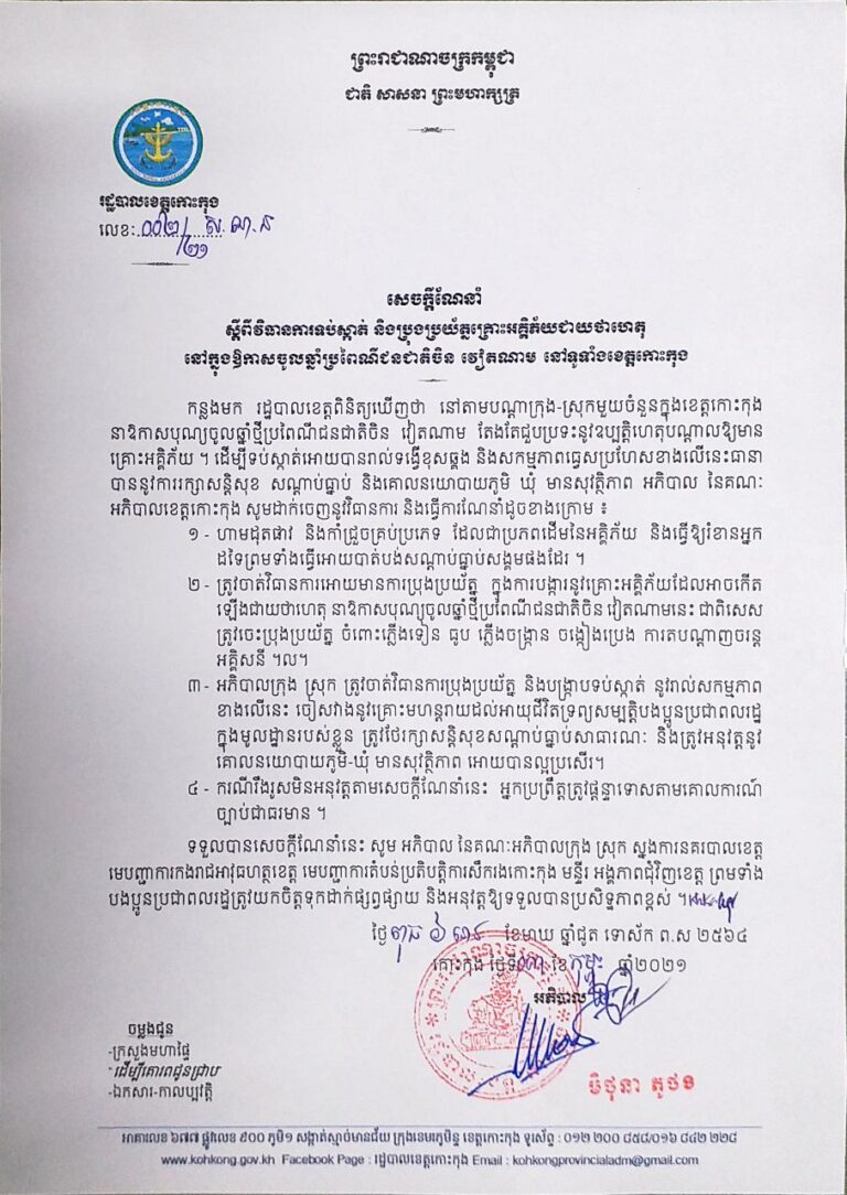 សេចក្តីណែនាំ ស្តីពីវិធានការទប់ស្កាត់ និងប្រុងប្រយ័ត្នអគ្គិភ័យជាយថាហេតុ នៅក្នុងឱកាសចូលឆ្នាំប្រពៃណីជនជាតិចិន វៀតណាម នៅទូទាំងខេត្តកោះកុង