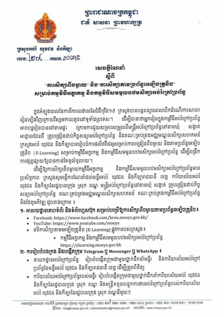 ក្រសួងអប់រំ យុវជន និងកីឡា ណែនាំស្តីពី «ការសិក្សាពីចម្ងាយ» និង «ការសិក្សាតាមប្រព័ន្ធអេឡិចត្រូនិច» សម្រាប់កម្មវិធីអក្ខរកម្ម និងកម្មវិធីសមមូលបឋមសិក្សាអប់រំក្រៅប្រព័ន្ធ។