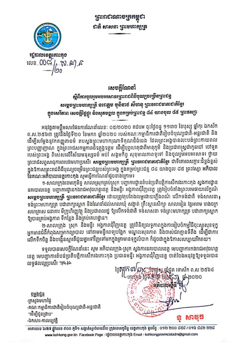 សេចក្តីណែនាំ ស្តីពីការចូលរួមអបអរសាទរព្រះរាជពិធីបុណ្យចម្រើនព្រះជន្ម សម្តេចព្រះមហាក្សត្រី នរោត្តម មុនីនាថ សីហនុ ព្រះវររាជមាតាជាតិខ្មែរ ក្នុងសេរីភាព សេចក្ដីថ្លៃថ្នូរ និងសុភមង្គល ក្នុងគម្រប់ព្រះជន្ម ៨៤ យាងចូល ៨៥ ព្រះវស្សា