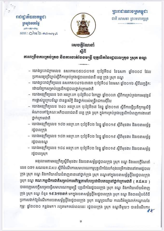 សេចក្តីណែនាំលេខ ០២៦សណន ចុះថ្ងៃសុក្រ ១១កើត ខែស្រាពណ៍ ឆ្នាំជូត ទោស័ក ព.ស.២៥៦៤ ត្រូវនឹងថ្ងៃទី៣១ ខែកក្កដា ឆ្នាំ២០២០ ស្តីពីការពង្រឹងការគ្រប់គ្រង និងការចាត់ចែងមន្រ្តី បុគ្គលិកនៃរដ្ឋបាលថ្នាក់ក្រុង ស្រុក ខណ្ឌ