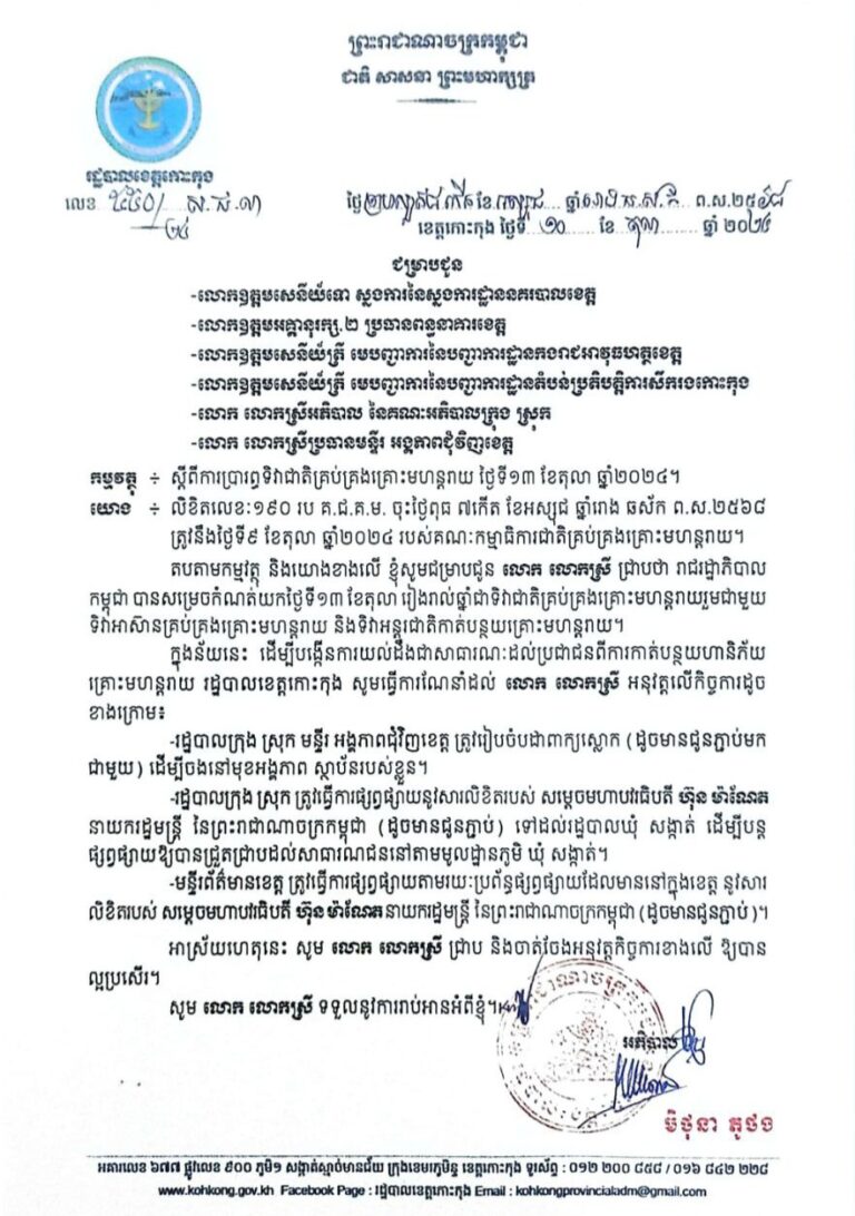 សេចក្តីណែនាំ ស្តីពីការប្រារព្ធទិវាជាតិគ្រប់គ្រងគ្រោះមហន្តរាយ ថ្ងៃទី១៣ ខែតុលា ឆ្នាំ២០២៤