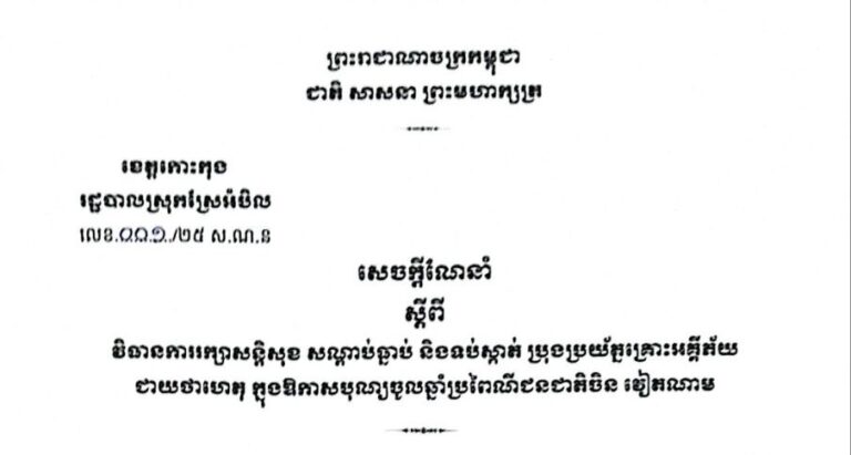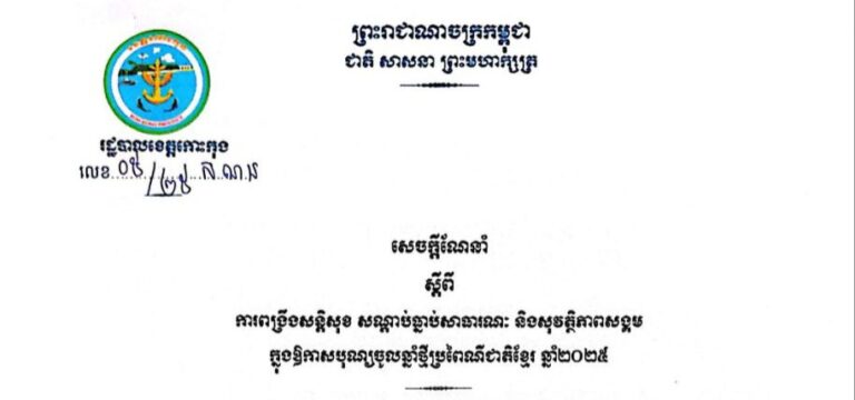 សេចក្តីណែនាំ ស្តីពីវិធានការរក្សាសន្តិសុខ សុវត្ថិភាព សណ្តាប់ធ្នាប់ និងទប់ស្កាត់ និងប្រុងប្រយ័ត្នគ្រោះអគ្គិភ័យ ជាយថាហេតុ នាឱកាសបុណ្យចូលឆ្នាំប្រពៃណីជនជាតិចិន វៀតណាម នៅទូទាំងខេត្តកោះកុង