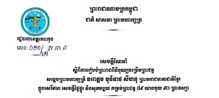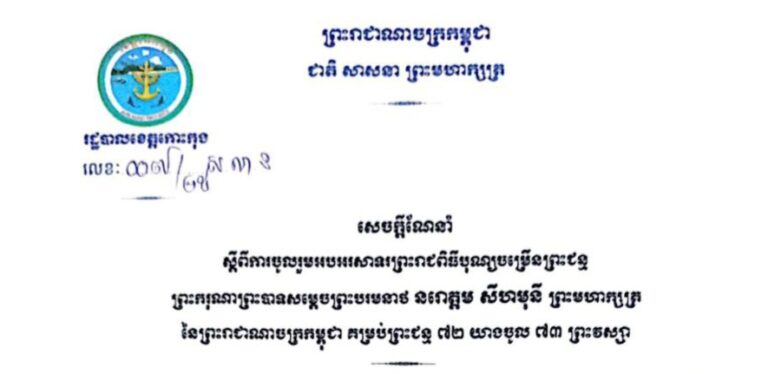 សេចក្តីណែនាំ ស្តីពីការចូលរួមអបអរសាទរព្រះរាជពិធីបុណ្យចម្រើនព្រះជន្ម សម្តេចព្រះបរមនាថ នរោត្តម សីហមុនី ព្រះមហាក្សត្រ ព្រះករុណាព្រះបាទសម្តេ នៃព្រះរាជាណាចក្រកម្ពុជា គម្រប់ព្រះជន្ម ៧២ យាងចូល ៧៣ ព្រះវស្សា