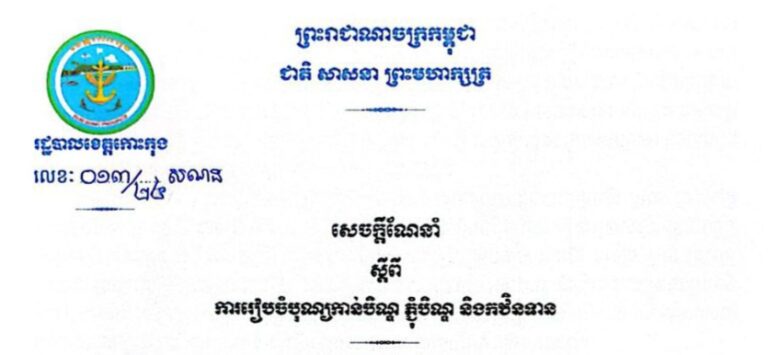 សេចក្តីណែនាំ ស្តីពីការរៀបចំផែនការពង្រឹងសន្តិសុខ សណ្តាប់ធ្នាប់សាធារណៈក្នុងខេត្តកោះកុង