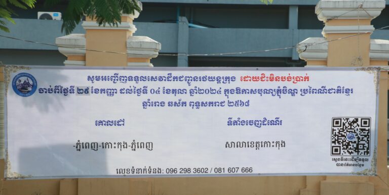 រដ្ឋបាលខេត្តកោះកុង មានកិត្តិយសសូមជម្រាបជូន ដល់សាធារណជន និងបងប្អូន ប្រជាពលរដ្ឋក្នុងខេត្តកោះកុង មេត្តាជ្រាបថា អនុវត្តតាមប្រសាសន៍ដឹកនាំដ៏ខ្ពង់ខ្ពស់បំផុត របស់ សម្តេចមហាបវរធិបតី ហ៊ុន ម៉ាណែត នាយករដ្ឋមន្ត្រី នៃព្រះរាជាណាចក្រកម្ពុជា កាលពីថ្ងៃទី១៦ ខែ កញ្ញា ឆ្នាំ២០២៤ រដ្ឋបាលរាជធានីភ្នំពេញ បានរៀបចំរថយន្តក្រុងចំនួន ៦៥៣គ្រឿង ក្នុងនោះ សម្រាប់ភ្នំពេញ-កោះកុង រថយន្តចំនួន ០៥ គ្រឿង សម្រាប់បម្រើសេវាដឹកជញ្ជូនសាធារណៈដែលមាន រយៈពេល ០៥ថ្ងៃ ចាប់ពីថ្ងៃទី៣០ ខែកញ្ញា ដល់ថ្ងៃទី០៤ ខែតុលា ឆ្នាំ២០២៤ ដោយជិះមិនបង់ប្រាក់” ដើម្បីជួយសម្រួលដល់ការចំណាយ ជូនបងប្អូនប្រជាពលរដ្ឋ ក្នុងការធ្វើដំណើរទៅលេងស្រុកកំណើត ជួបជុំបងប្អូនក្រុមគ្រួសារ ក្នុងឱកាសពិធីបុណ្យភ្ជុំបិណ្ឌប្រពៃណីជាតិខ្មែរ ឮសម្រាប់ថ្ងៃទី០៣ និង០៤ ខែតុលា ឆ្នាំ២០២៤ រថយន្តចាំទទួល ពីម៉ោង ៦.៣០ នាទីព្រឹក រហូតដល់ម៉ោង ១១.៣០ នាទីព្រឹក នៅមុខសាលាខេត្តកោះកុង រួចចេញដំណើរ