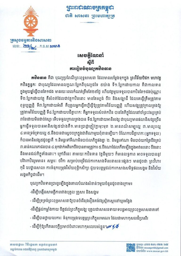 សេចក្តីណែនាំ ស្តីពីការរៀបចំបុណ្យកឋិនទាន
