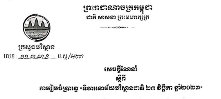សេចក្ដីណែនាំ ស្តីពីការរៀបចំប្រារព្ធ «ទិវាអនាម័យបរិស្ថានជាតិ ២៣ វិច្ឆិកា ឆ្នាំ២០២៣»