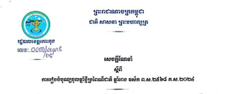 សេចក្តីណែនាំ ស្តីពីការរៀបចំបុណ្យចូលឆ្នាំថ្មីប្រពៃណីជាតិ ឆ្នាំរោង ឆស័ក ព.ស.២៥៦៨ គ.ស.២០២៤