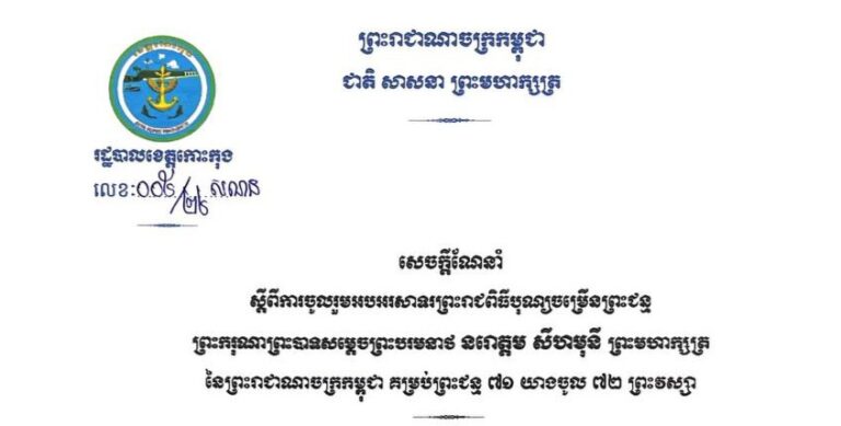 សេចក្តីណែនាំ ស្តីពីការចូលរួមអបអរសាទរព្រះរាជពិធីបុណ្យចម្រើនព្រះជន្ម ព្រះករុណាព្រះបាទសម្តេចព្រះបរមនាថ នរោត្តម សីហមុនី ព្រះមហាក្សត្រ នៃព្រះរាជាណាចក្រកម្ពុជា គម្រប់ព្រះជន្ម ៧១ យាងចូល ៧២ ព្រះវស្សា