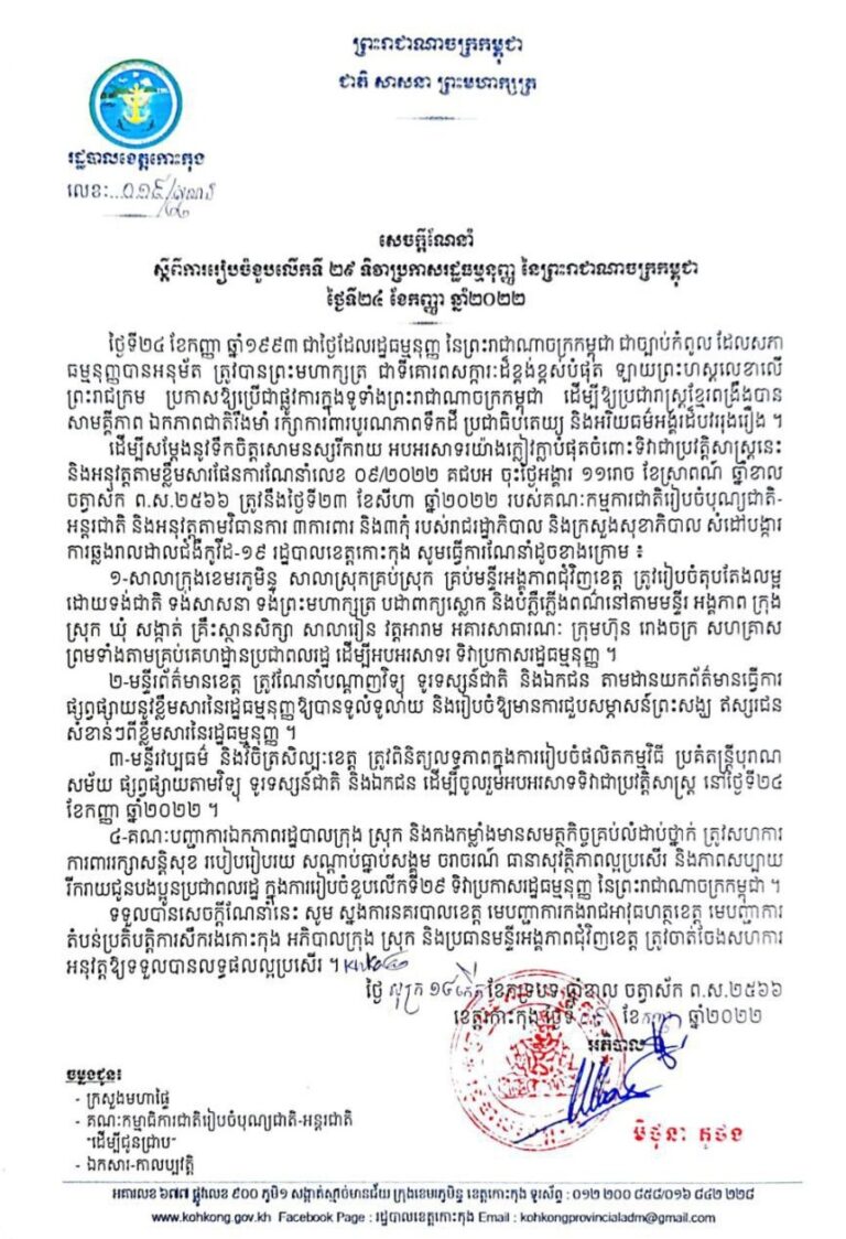 សេចក្តីណែនាំ ស្តីពីការរៀបចំខួបលើកទី ២៩ ទិវាប្រកាសរដ្ឋធម្មនុញ្ញ នៃព្រះរាជាណាចក្រកម្ពុជា ថ្ងៃទី២៤ ខែកញ្ញា ឆ្នាំ២០២២