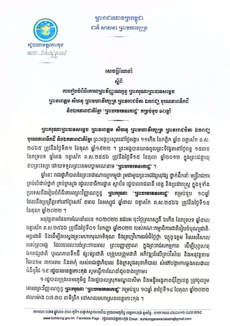 សេចក្តីណែនាំ ស្ដីពីការប្រារព្ធពិធីគោរពព្រះវិញ្ញាណក្ខន្ធ ព្រះករុណាព្រះបាទសម្តេច ព្រះនរោត្តម សីហនុ ព្រះមហាវីរក្សត្រ ព្រះវររាជបិតា ឯករាជ្យ បូរណភាពទឹកដី និងឯកភាពជាតិខ្មែរ “ព្រះបរបរតនកោដ្ឋ” គម្រប់ខួប ១០ឆ្នាំ