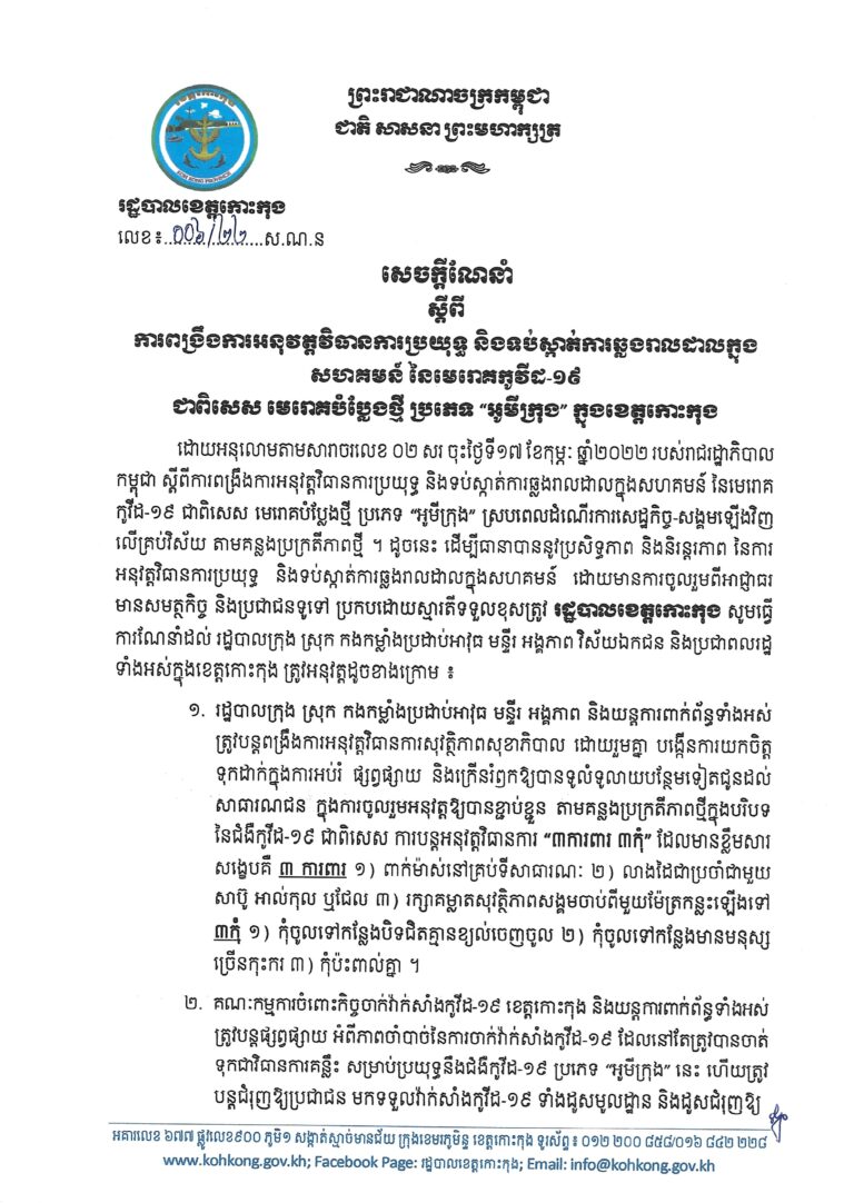 សេចក្តីណែនាំលេខ របស់រដ្ឋបាលខេត្តកោះកុង ស្តីពីការពង្រឹងការអនុវត្តវិធានការប្រយុទ្ធ និងទប់ស្កាត់ការឆ្លងរាលដាលក្នុងសហគមន៍ នៃមេរោគកូវីដ-១៩ ជាពិសេស មេរោគបម្លែងថ្មី ប្រភេទ “អូមីក្រុង” ក្នុងខេត្តកោះកុង