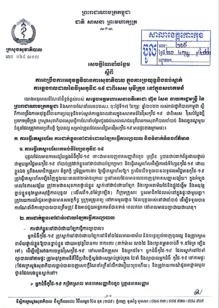 សេចក្តីណែនាំបន្ថែម ស្តីពីការពង្រឹងការអនុវត្តវិធានការសុខាភិបាល ក្នុងការប្រយុទ្ធនិងទប់ស្កាត់ ការឆ្លងរាលដាលនៃវីរុសកូវីដ-១៩ ជាពិសេស អូមីក្រុង នៅក្នុងសហគមន៍