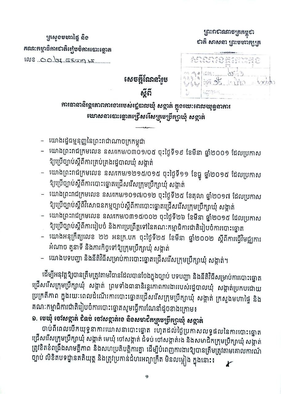 សេចក្តីណែនាំរួម ស្តីពីការធានានិរន្តរភាពការងាររបស់រដ្ឋបាលឃុំ សង្កាត់ ក្នុងរយៈពេលយុទ្ធនាការឃោសនាបោះឆ្នោតជ្រើសរើសក្រុមប្រឹក្សាឃុំ សង្កាត់