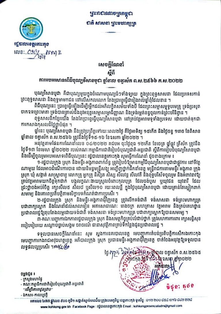 សេចក្តីណែនាំ ស្តីពីការអបអរសាទរពិធីបុណ្យវិសាខបូជា ឆ្នាំខាល ចត្វាស័ក ព.ស.២៥៦៦ គ.ស.២០២២