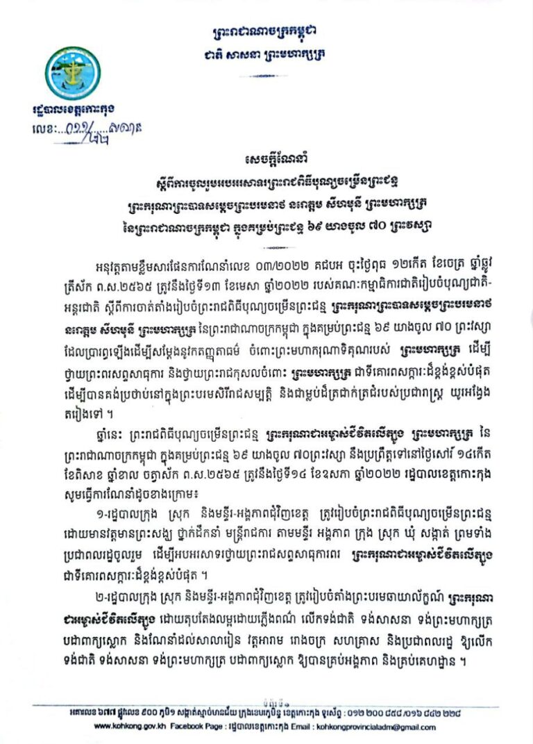 សេចក្ដីណែនាំ ស្ដីពីការចូលរួមអបអរសាទរព្រះរាជពិធីបុណ្យចម្រើនព្រះជន្ម ព្រះករុណា ព្រះបាទសម្តេចព្រះបរមនាថ នរោត្តម សីហមុនី ព្រះមហាក្សត នៃព្រះរាជាណាចក្រកម្ពុជា ក្នុងគម្រប់ព្រះជន្ម ៦៩ យាងចូល ៧០ ព្រះវស្សា