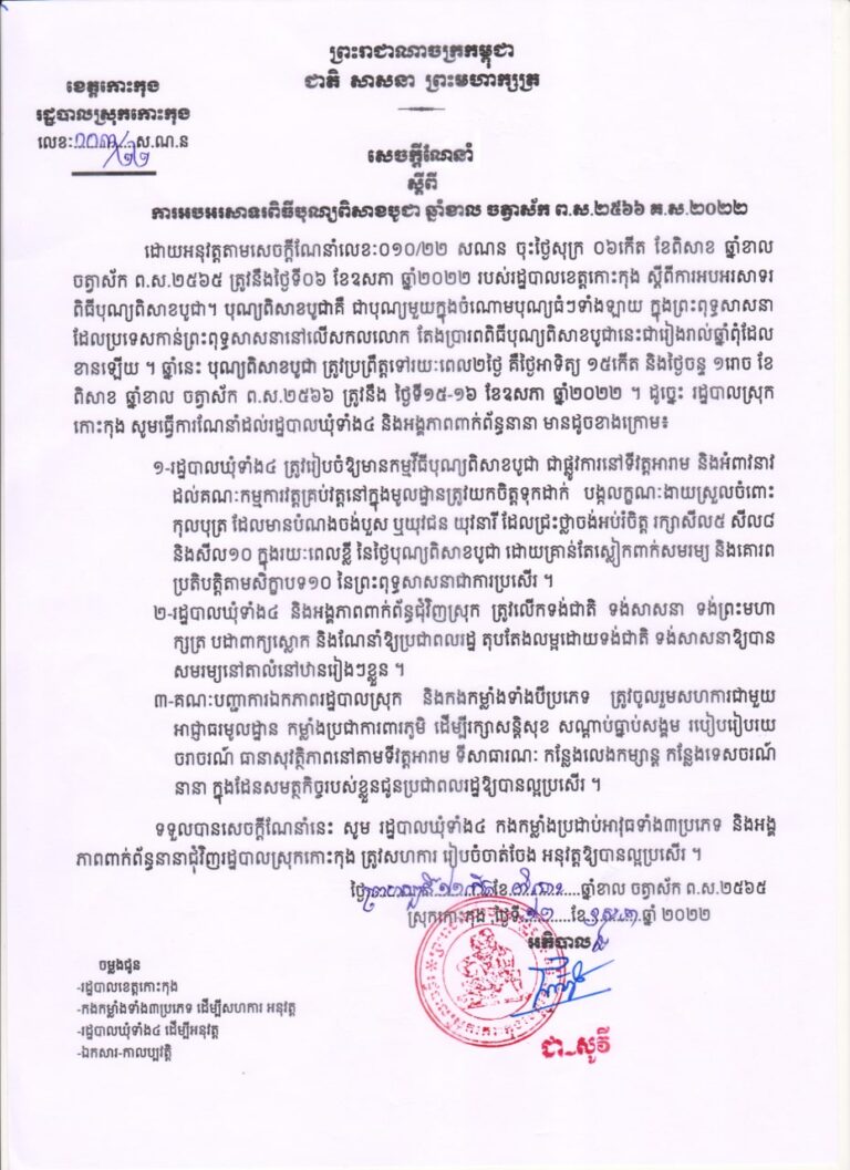 សេចក្តីណែនាំលេខ ០០៣/២២ ស.ណ.ន ស្តីពីការអបអរសាទរពិធីបុណ្យពិសាខបូជា ឆ្នាំខាល ចត្វាស័ក ព.ស.២៥៦៦ គ.ស.២០២២ នៅតាមបណ្តាឃុំទាំង៤ នៃស្រុកកោះកុង ខេត្តកោះកុង របស់រដ្ឋបាលស្រុកកោះកុង