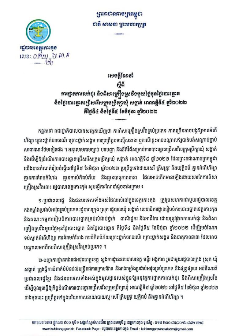 សេចក្ដីណែនាំ ស្តីពីការផ្អាកការលក់ដូរ និងពិសាគ្រឿងស្រវឹងមួយថ្ងៃមុនថ្ងៃបោះឆ្នោត និងថ្ងៃបោះឆ្នោតជ្រើសរើសក្រុមប្រឹក្សាឃុំ សង្កាត់ អាណត្តិទី៥ ឆ្នាំ២០២២ គឺថ្ងៃទី៤ និងថ្ងៃទី៥ ខែមិថុនា ឆ្នាំ២០២២