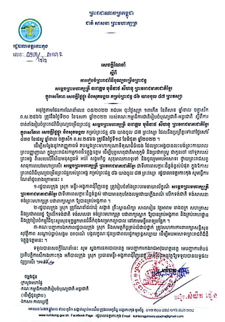 សេចក្ដីណែនាំ ស្តីពីការរៀបចំព្រះរាជពិធីបុណ្យចម្រើនព្រះជន្ម សម្តេចព្រះមហាក្សត្រី នរោត្តម មុនិនាថ សីហនុ ព្រះវររាជមាតាជាតិរឹខ្មែរ ក្នុងសេរីភាព សេចក្តីថ្លៃថ្នូរ និងសុភមង្គល គម្រប់ព្រះជន្ម ៨៦ យាងចូល ៨៧ ព្រះវស្សា