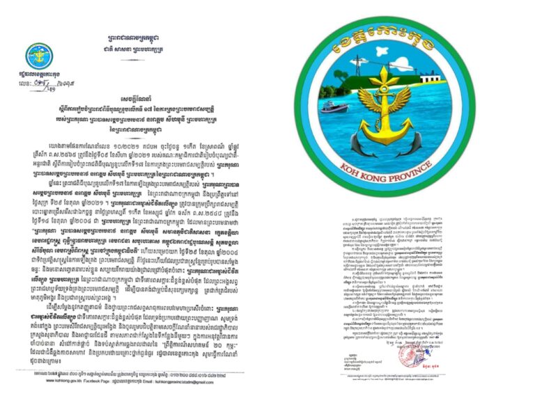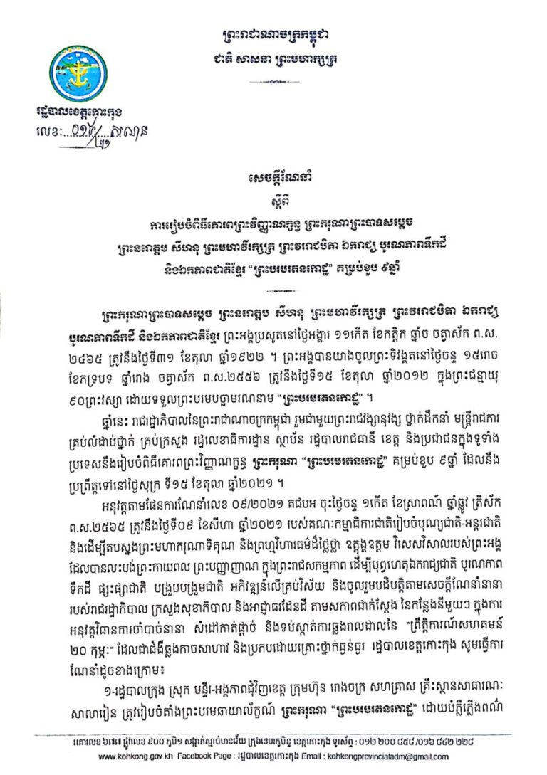 សេចក្តីណែនាំ របស់រដ្ឋបាលខេត្តកោះកុង សស្តីពីការផ្អាកការរៀបចំពិធីបុណ្យកាន់បិណ្ឌ និងភ្ជុំបិណ្ឌ ដើម្បីទប់ស្កាត់ការឆ្លងរាលដាលនៃជំងឺកូវីដ-១៩