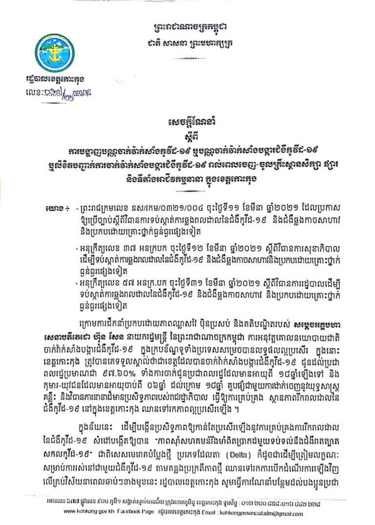 សេចក្តីណែនាំ ស្តីពីការបង្ហាញបណ្ណចាក់វ៉ាក់សាំងកូវីដ-១៩ ឬបណ្ណចាក់វ៉ាក់សាំងបង្ការជំងឺកូវីដ-១៩ ឬលិខិតបញ្ជាក់ការចាក់វ៉ាក់សាំងបង្ការជំងឺកូវីដ-១៩ រាល់ពេលចេញ-ចូលគ្រឹះស្ថានសិក្សា ផ្សារ និងទីតាំងអាជីវកម្មនានា ក្នុងខេត្តកោះកុង