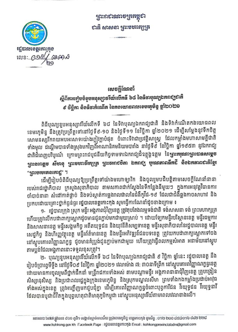 សេចក្តីណែនាំ ស្តីពីការរៀបចំខួបអនុស្សាវរីយ៍លើកទី ៦៨ នៃទិវាបុណ្យឯករាជ្យជាតិ ៩ វិច្ឆិកា និងទិវាកំណើត នៃកងយោធពលខេមរៈភូមិន្ទ ឆ្នាំ២០២១