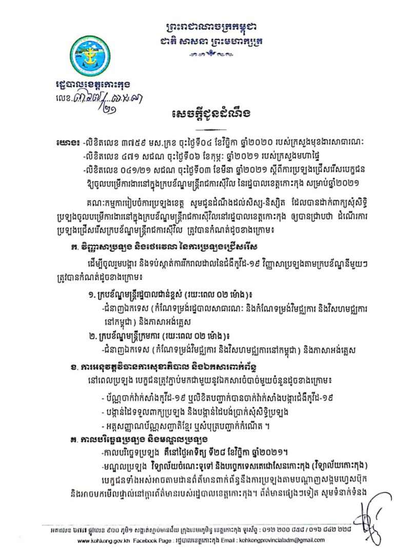 សេចក្តីជូនដំណឹង ស្តីពីប្រឡងចូលក្របខ័ណ្ឌមន្ត្រីរាជការស៊ីវិល នៅរដ្ឋបាលខេត្តកោះកុង