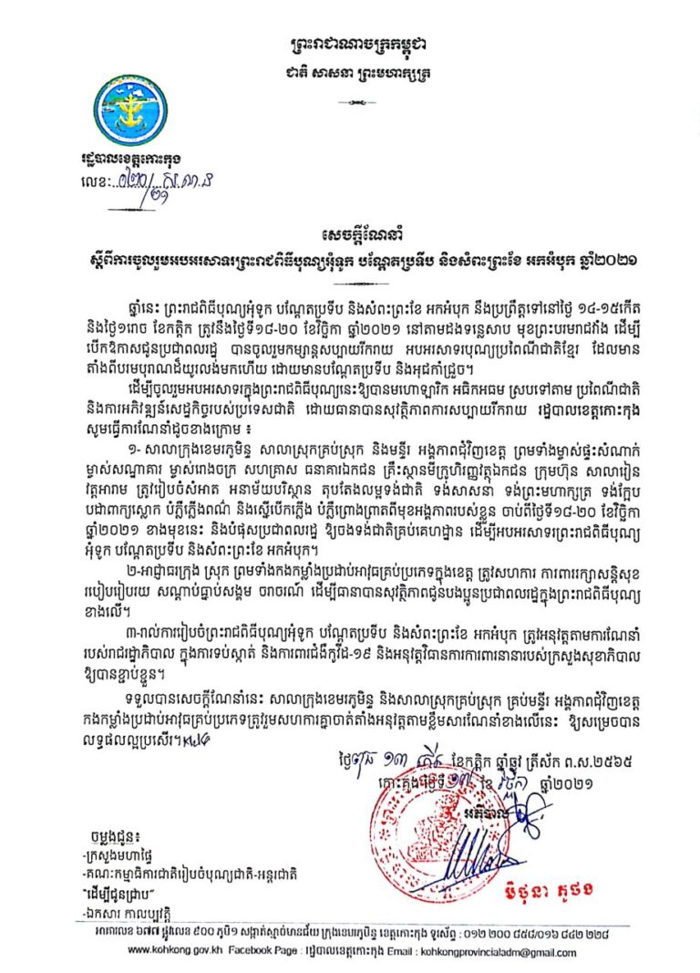 សេចក្តីណែនាំ ស្តីពីការចូលរួមអបអរសាទរព្រះរាជពិធីបុណ្យអុំទូក បណ្តែតប្រទីប និងសំពះព្រះខែ អកអំបុក ឆ្នាំ២០២១
