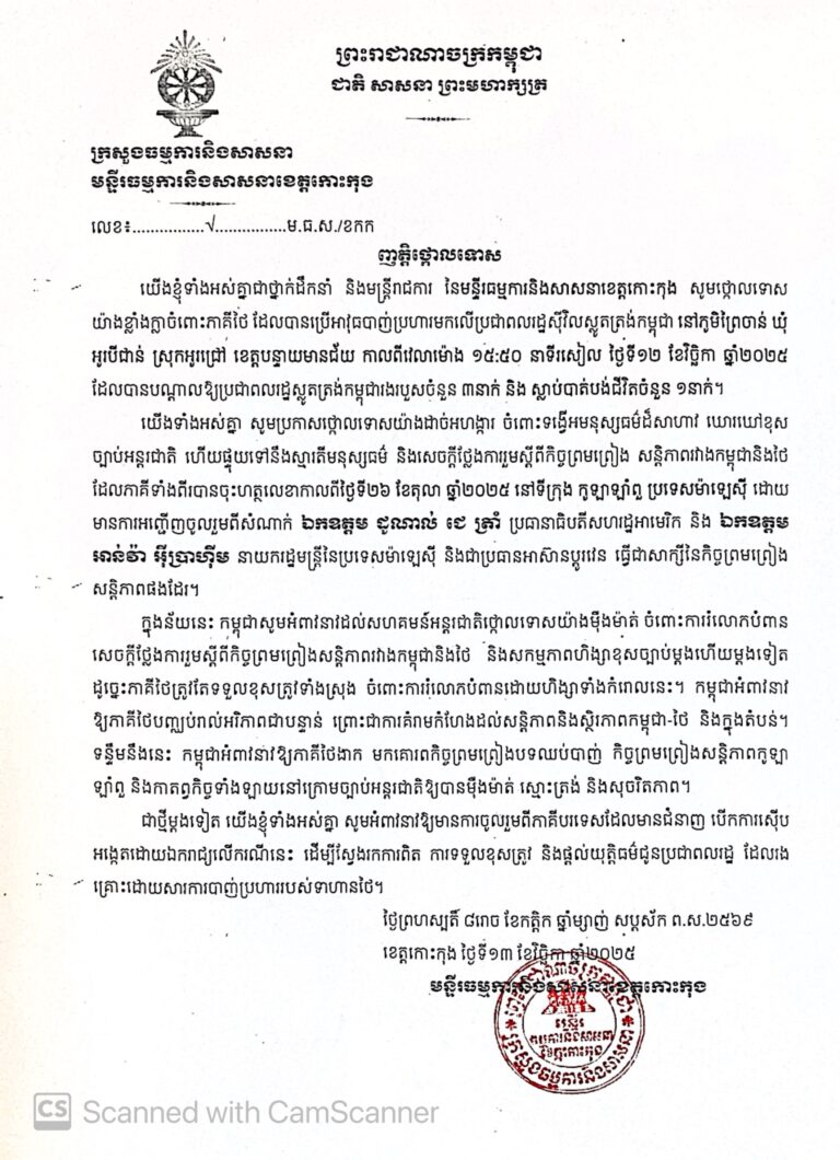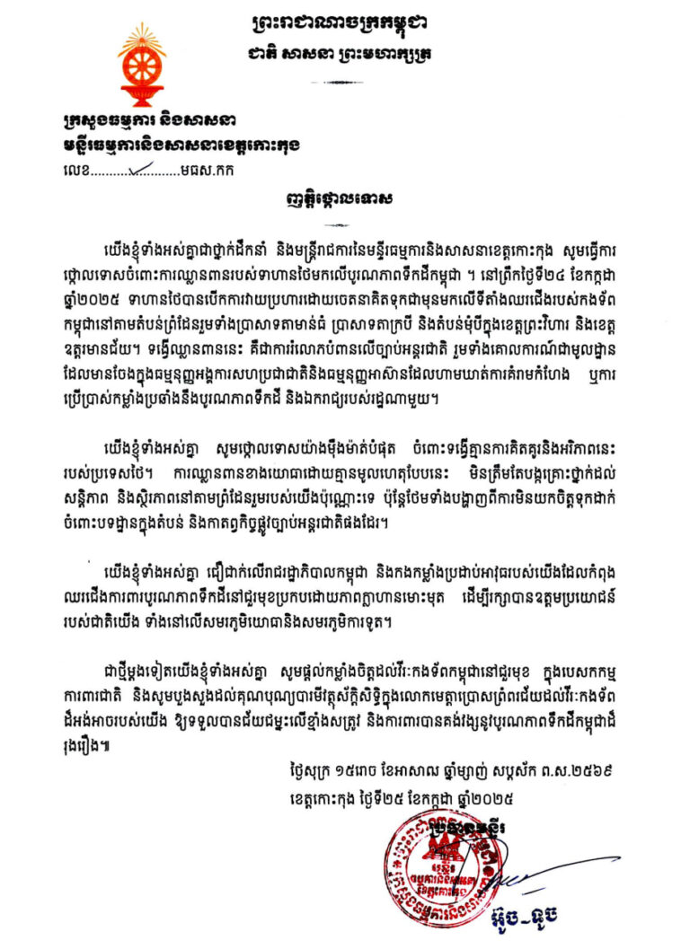 មន្ទីរធម្មការនិងសាសនាខេត្តកោះកុងសូមថ្កោលទោសចំពោះការឈ្លានពានរបស់ទាហានថៃមកលេីបូរណភាពទឹកដីកម្ពុជានៅព្រឹកថ្ងៃទី២៤ ខែកក្កដា ឆ្នាំ២០២៥