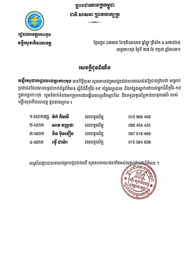 សេចក្តីជូនដំណឹង របស់មន្ទីរសុខាភិបាល នៃរដ្ឋបាលខេត្តកោះកុង
