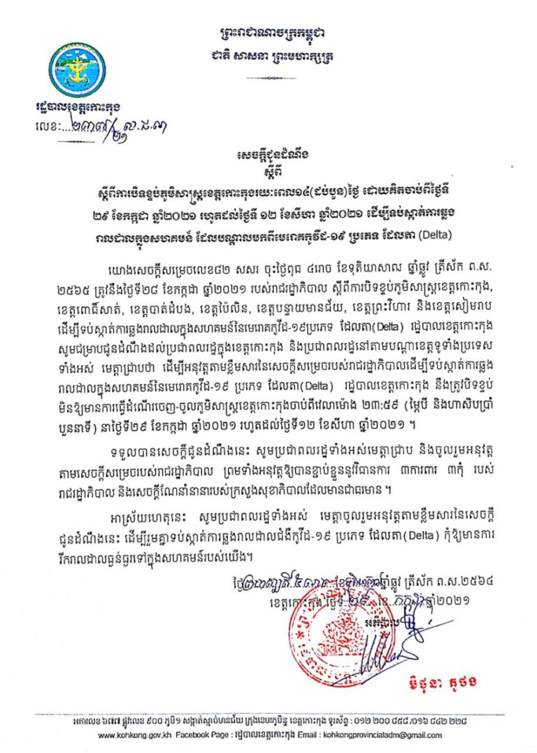 សេចក្តីជូនដំណឹង ស្តីពីការបិទខ្ទប់ភូមិសាស្ត្រខេត្តកោះកុង រយៈពេល១៤(ដប់បួន)ថ្ងៃ ដោយគិតចាប់ពីថ្ងៃទី២៩ ខែកក្កដា ឆ្នាំ២០២១ រហូតដល់ថ្ងៃទី១២ ខែសីហា ឆ្នាំ២០២១ ដើម្បីទប់ស្កាត់ការឆ្លង រាលដាលក្នុងសហគមន៍ ដែលបណ្តាលបកពីរមេរោគកូវីដ-១៩ ប្រភេទ ដែលតា(Delta)