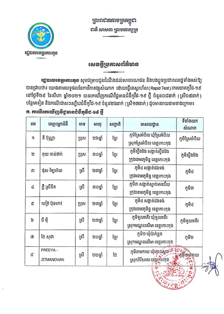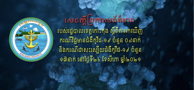 សេចក្តីប្រកាសព័ត៌មាន របស់រដ្ឋបាលខេត្តកោះកុង ស្តីពីការរកឃើញករណីវិជ្ជមានជំងឺកូវីដ-១៩ ចំនួន ០៨នាក់ និងករណីជាសះស្បើយជំងឺកូវីដ-១៩ ចំនួន ១៧នាក់ នៅថ្ងៃទី២៦ ខែសីហា ឆ្នាំ២០២១