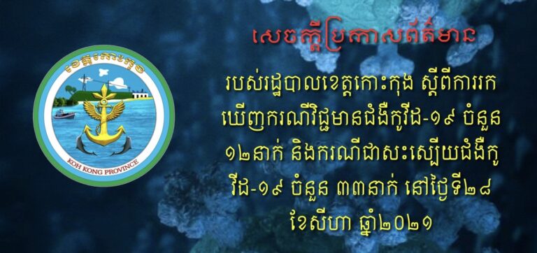 សេចក្តីប្រកាសព័ត៌មាន របស់រដ្ឋបាលខេត្តកោះកុង ស្តីពីការរកឃើញករណីវិជ្ជមានជំងឺកូវីដ-១៩ ចំនួន ១២នាក់ និងករណីជាសះស្បើយជំងឺកូវីដ-១៩ ចំនួន ៣៣នាក់ នៅថ្ងៃទី២៨ ខែសីហា ឆ្នាំ២០២១
