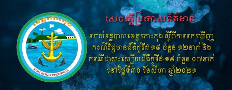 សេចក្តីប្រកាសព័ត៌មាន របស់រដ្ឋបាលខេត្តកោះកុង ស្តីពីការរកឃើញករណីវិជ្ជមានជំងឺកូវីដ-១៩ ចំនួន ១២នាក់ និងករណីជាសះស្បើយជំងឺកូវីដ-១៩ ចំនួន ០៧នាក់ នៅថ្ងៃទី៣០ ខែសីហា ឆ្នាំ២០២១
