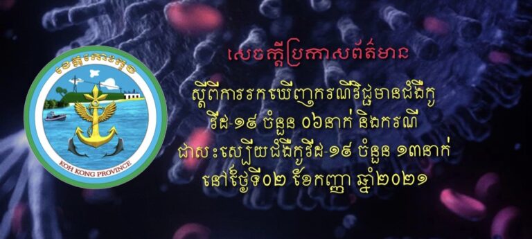 សេចក្តីប្រកាសព័ត៌មាន របស់រដ្ឋបាលខេត្តកោះកុង ស្តីពីការរកឃើញករណីវិជ្ជមានជំងឺកូវីដ-១៩ ចំនួន ០៦នាក់ និងករណីជាសះស្បើយជំងឺកូវីដ-១៩ ចំនួន ១៣នាក់ នៅថ្ងៃទី០២ ខែកញ្ញា ឆ្នាំ២០២១