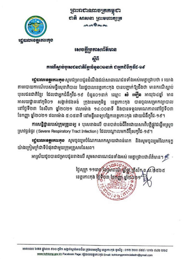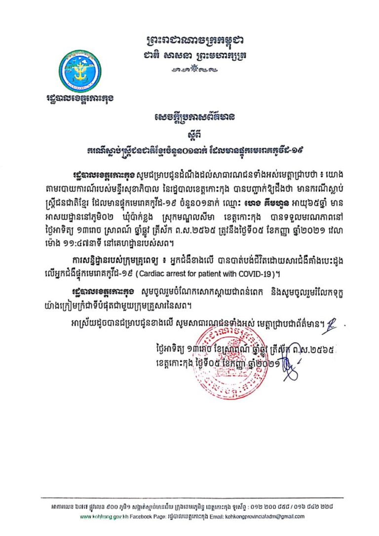 សេចក្តីប្រកាសព័ត៌មាន ស្តីពីករណីស្លាប់ស្ត្រីជនជាតិខ្មែរ ចំនួន ០១នាក់ ជាអ្នកជំងឺកូវីដ-១៩