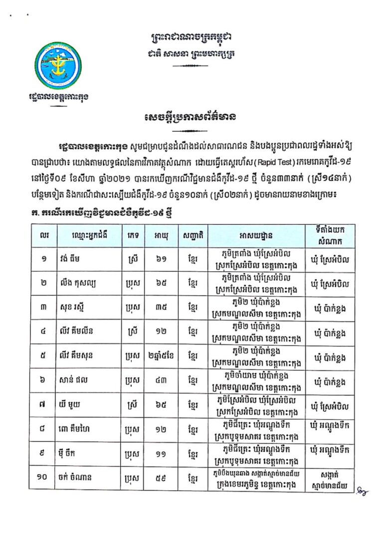 សេចក្តីប្រកាសព័ត៌មាន របស់រដ្ឋបាលខេត្តកោះកុង ស្តីពីការរកឃើញករណីវិជ្ជមានជំងឺកូវីដ-១៩ ចំនួន ៣៣នាក់ និងករណីជាសះស្បើយជំងឺកូវីដ-១៩ ចំនួន ១៩នាក់ នៅថ្ងៃទី០៩ ខែសីហា ឆ្នាំ២០២១